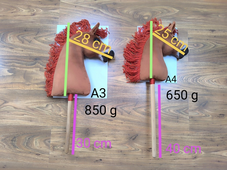 Rozmiar A3 (szerokość ok. 28 cm, wysokość głowy z uszami ok. 40 cm, kij ok. 30 cm),