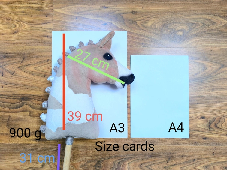 – Rozmiar A3 (szerokość głowy ok. 27 cm, wysokość głowy z uszami ok. 40 cm, kij ok. 31 cm),